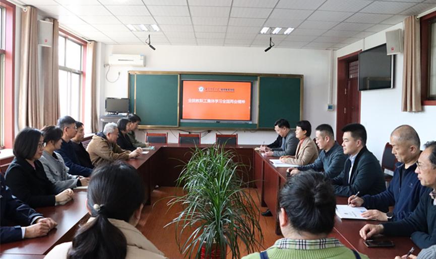 3月15日下午,为深入学习贯彻习近平新时代中国特色社会主义思想和党的二十大精神,及时深入学习2024年全国两会精神,学院组织全院教职工开展专题学习会,本次会议由学院党总支书记茌淑君主持。