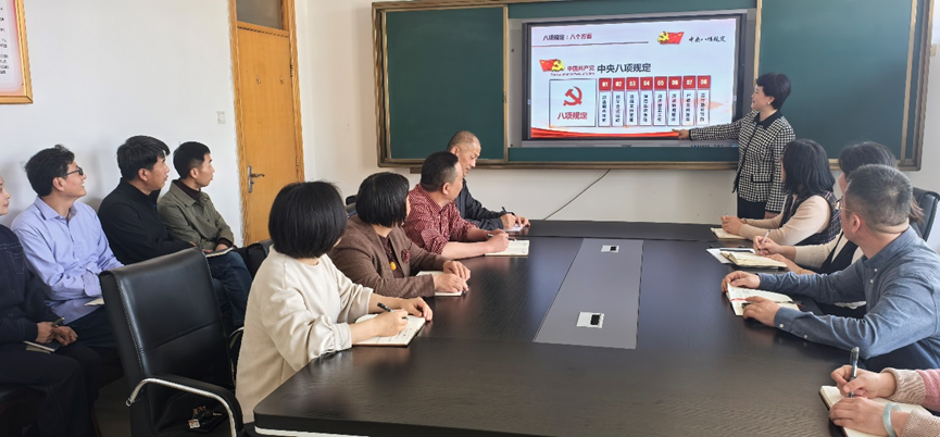 茌淑君围绕中央八项规定精神的背景介绍、主要内容、政策图解、数字解读、关键词汇五个方面,对中央八项规定精神进行了深入解读。她指出,2012年12月4日,中共中央政治局召开会议,审议通过了中央政治局关于改进工作作风、密切联系群众的八项规定,该文件从新时代党的建设全局出发,系统构建了作风建设的制度框架,具体内容包括改进调查研究、精简会议活动、精简文件简报、规范出访活动、改进警卫工作、改进新闻报道、严格文稿发表和厉行勤俭节约。她结合学院实际,重点对《落实中央八项规定精神政策图解》中公务外出管理、会议活动规范、办公用房配置、个人自律要求等关键领域进行了深入剖析,并通过分析近年来查处的违反中央八项规定精神典型案例数据,警示全体教职工时刻保持敬畏之心,筑牢纪律底线,切实将中央八项规定精神转化为日常工作的行为准则。