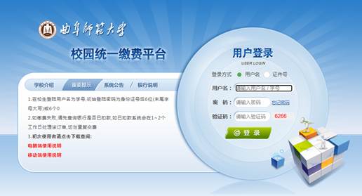 网址的主页下方的缴费平台,选择用户名登录,用户名即学号,初始密码为Qfnu#加身份证号后六位(身份证号末尾字母大写);也可选择证件号登录,输入身份证号码、姓名、验证码,第一次登录后请及时修改密码。