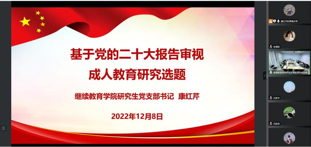 会上,学院研究生党支部书记康红芹以“基于党的二十大报告审视成人教育研究选题”为题,为av动漫