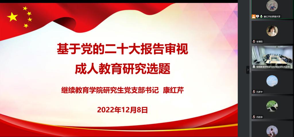 会上,学院研究生党支部书记康红芹以“基于党的二十大报告审视成人教育研究选题”为题,为av动漫